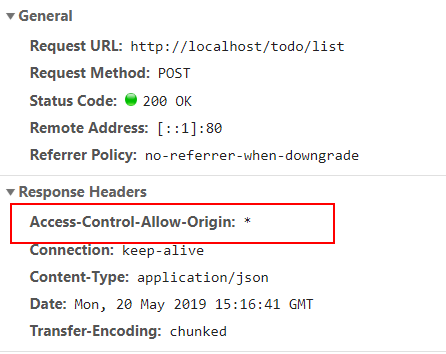 现在再来访问本地的index.html,发现已经可以请求成功了,http 响应头正确的输出了cors 跨域的信息。