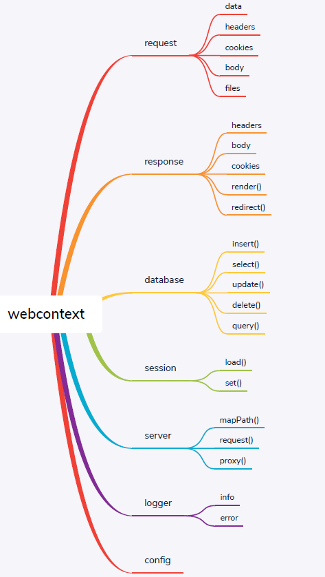 webcontext的结构设计参考了asp.net的优雅设计,用一个context对象做为容器,非常方便 的调用request,response,session这些http请求处理操作类,即使在ejs模板中,也可以通过this获取到context,直接进行http处理或数据库操作。并扩展了许多功能,如使用database对象操作数据库,logger对象写入日志等。 主要结构如下: