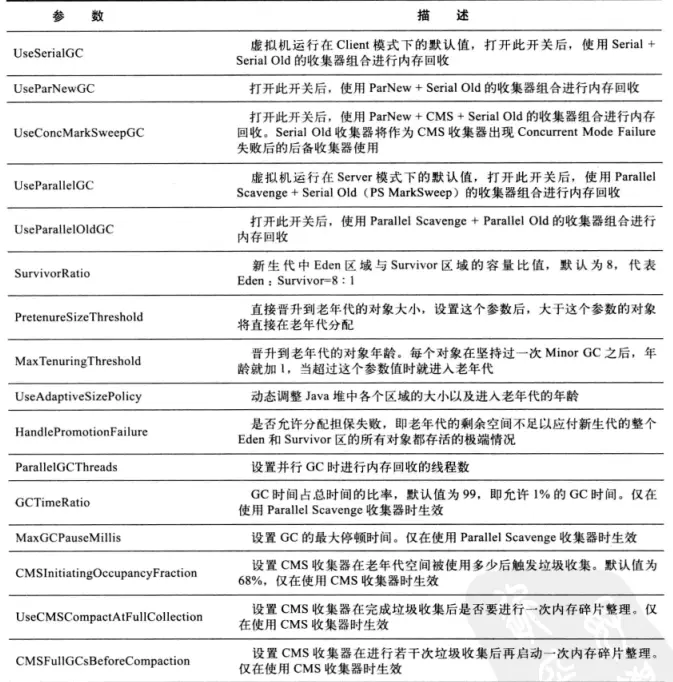 - -XX:+UseAdaptiveSizePolicy:开关参数,打开以后就由虚拟机自动调节策略。这也是跟ParNew收集器的一个重要区别