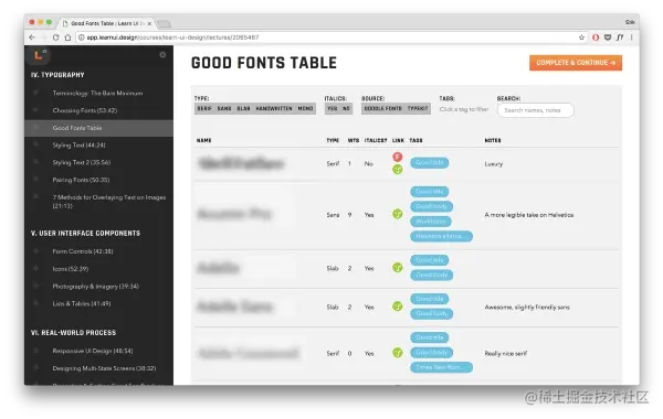 Learn UI Design。寻找更好的字体?作者的用户界面设计课程有一个字体推荐列表,包含超过 60 种免费,涵盖所有类型的字体(衬线,平板,等宽字体,手写等),并包括每个字体的注释 字体效果最好。