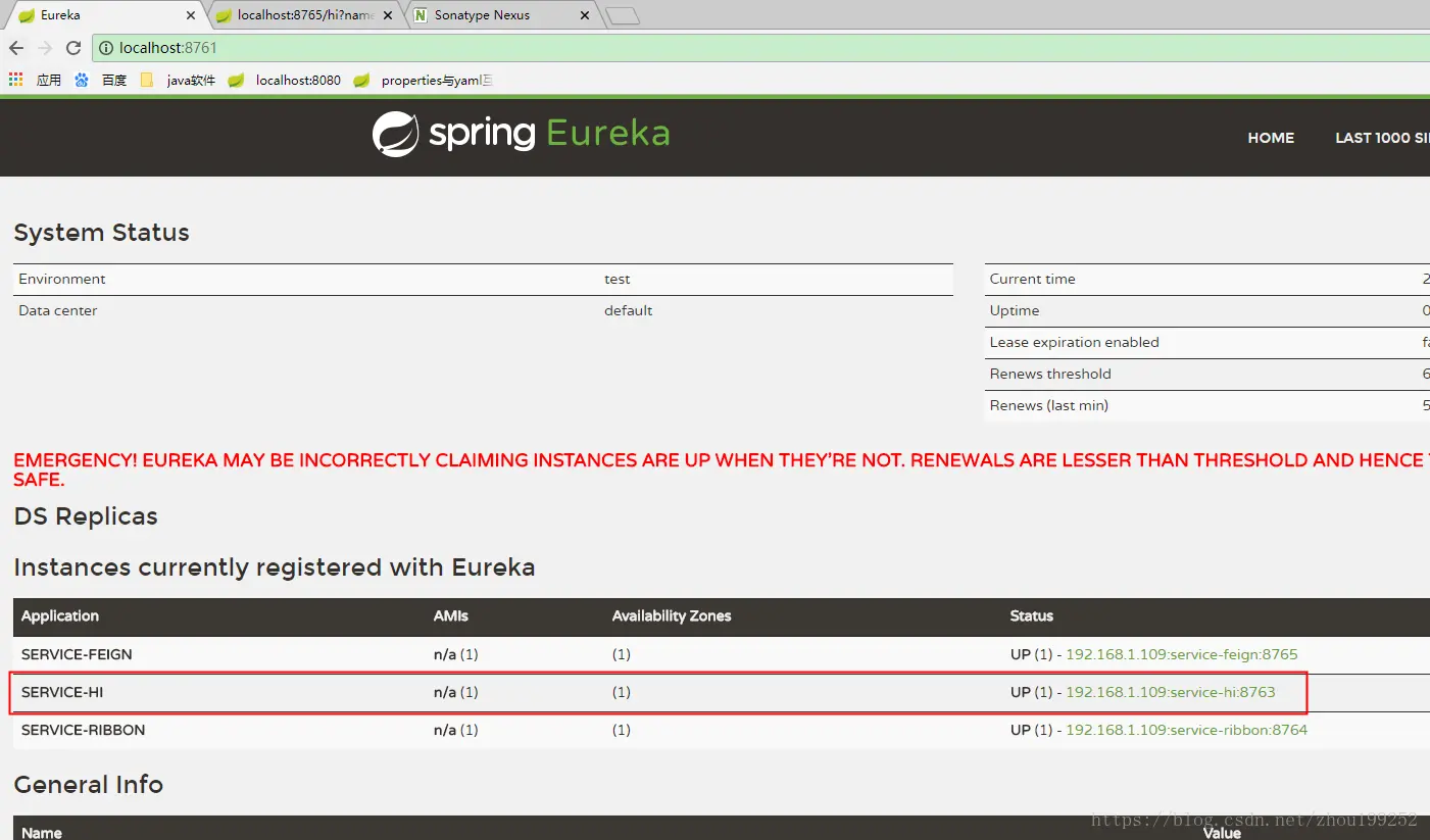 红框内为已经注册的服务。这里我们只有服务中心,没有写生产者,所以红框中的内容应该是空。