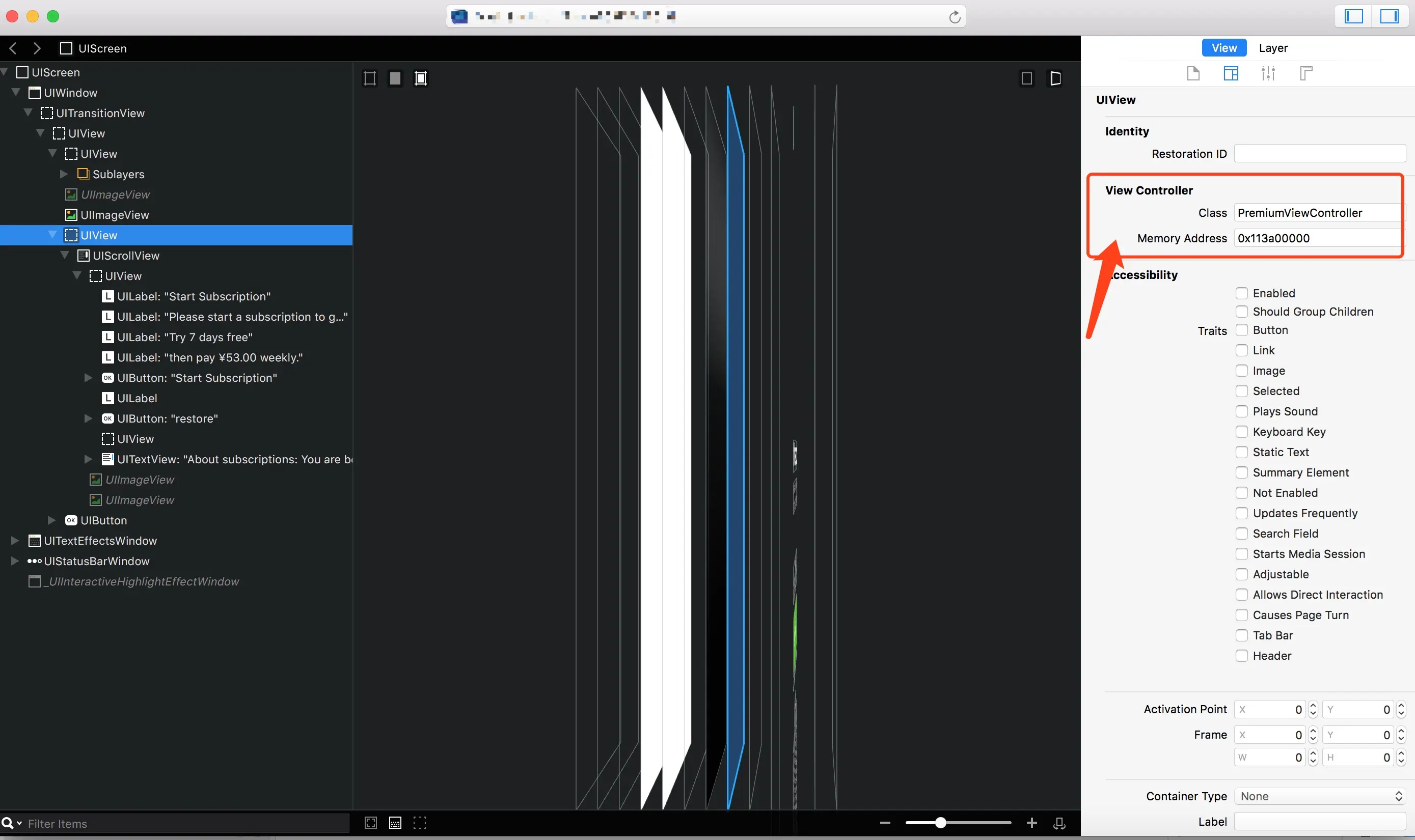 使用Reveal工具查看当前界面,如下图,看到当前控制器名称是 PremiumViewController。