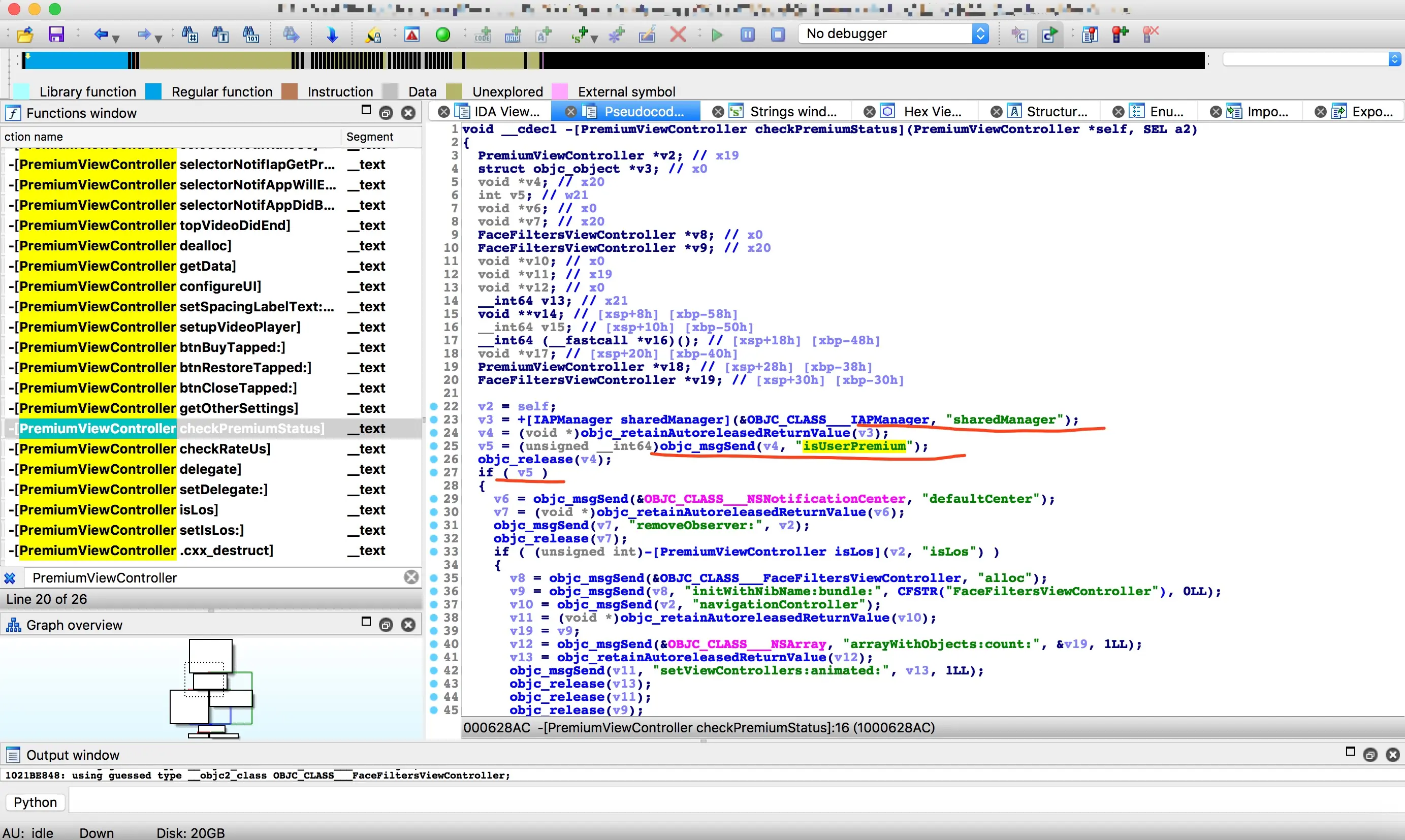 我们猜测 IAPManager 类的 isUserPremium 方法可能有关,这个方法返回一个BOOL值,并作为 if 语句的判断条件。