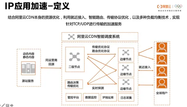 IP应用加速架构如下图所示,首先,全球用户就近接入边缘节点,通过阿里云的智能调度系统接入二级节点,中间采用传输协议优化和路由优化,选取最快、最优的路径。最后,二级节点到源站则选择相同运营商进行回源。