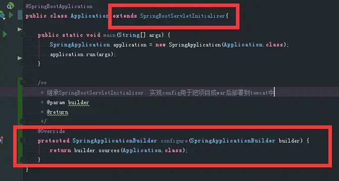 启动类中:继承 SpringBootServletInitializer。然后实现configure。