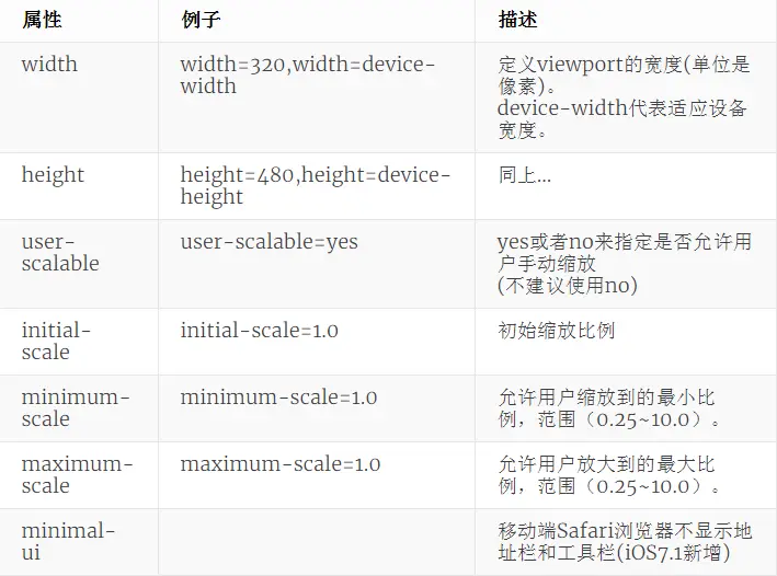 viewport,可以让布局在移动浏览器上显示的更好<meta name ="viewport" content =" width=device-width, initial-scale=1.0, maximum-scale=3.0, minimum-scale=1.0, user-scalable=no " >width=device-width会导致 iPhone5 添加到主屏后以 WebApp 全屏模式打开页面时出现黑边注意: