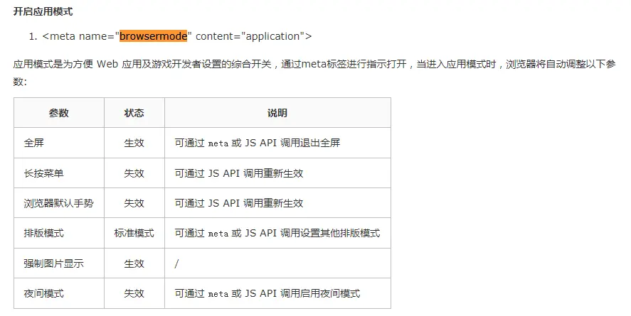 <!-- UC应用模式:默认全屏,禁止长按菜单,禁止手势,标准排版,强制图片显示 --> <meta name="browsermode" content="application"> <!-- QQ应用模式 --> <meta name="x5-page-mode" content="app">browsermode作用:<!-- UC使用适屏模式显示 --> <meta name="layoutmode" content="fitscreen"> <!-- UC强制图片显示 --> <meta name="imagemode" content="force"> <!-- UC禁止夜间模式显示 enable|disable --> <meta name="nightmode" content="disable"> <!-- UC当页面有太多文字时禁止缩放 --> <meta name="wap-font-scale" content="no"> -