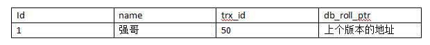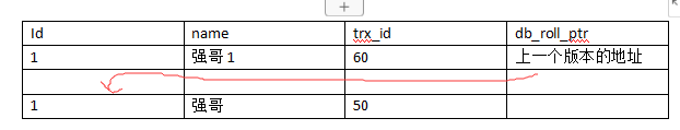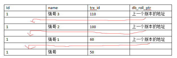 提交事务id是60的记录后,接着有一个事务id为100的事务,修改name=强哥2,但是事务还没提交。则此时的版本链是: