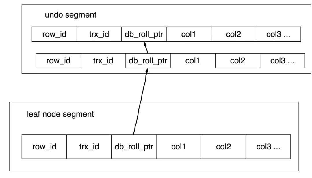 InnoDB行记录中除了刚才提到的rowid外,还有trx_id和db_roll_ptr, trx_id表示最近修改的事务的id,db_roll_ptr指向undo segment中的undo log。