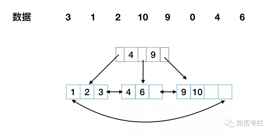 如有 3、1、2、10、9、0、4、6这8个数据,可建立如图1-4-1所示高度为2的B+树。