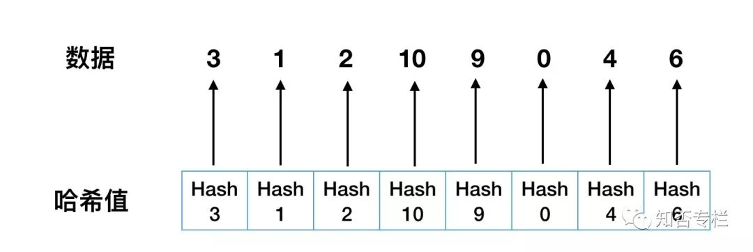 如有 3、1、2、10、9、0、4、6这8个数据,建立如 图1-1所示哈希索引。