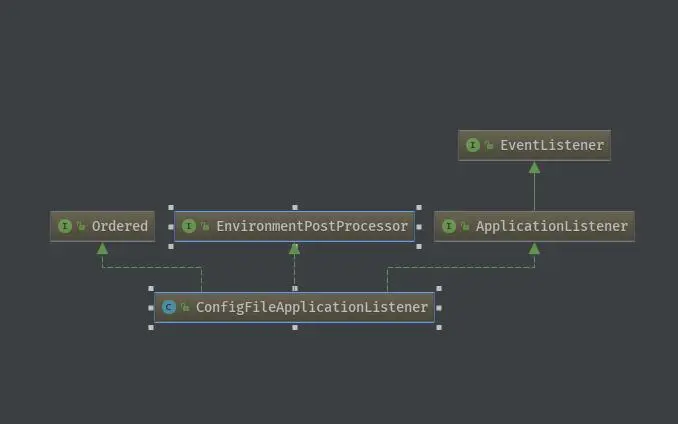 可以观察以上类图,事件将被SimpleApplicationEventMulticaster发送到注册到上下文中的listeners中,其中一个叫做ConfigFileApplicationListener的监听者会把项目配置以PropertySource的形式加入到环境中 。