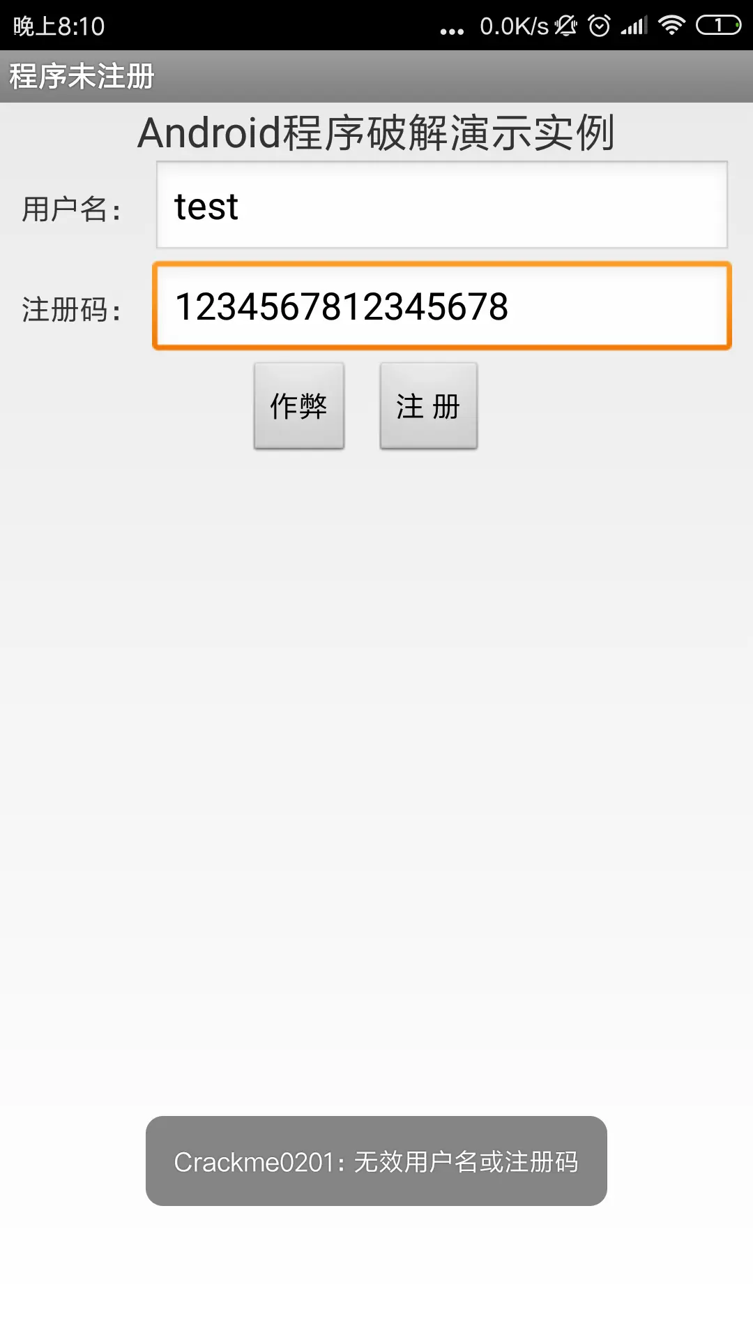 会在当前目录生成 crackme_new.apk 文件,注意这个安装包是未签名的,无法直接安装,需要先签名。使用 jarsinger 或者 apksigner 都可以。签名之后安装,输入用户名: