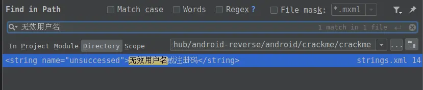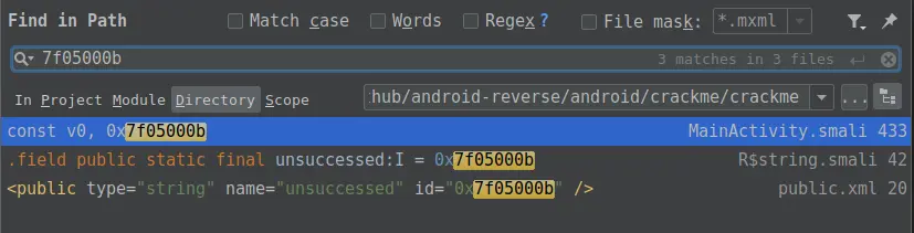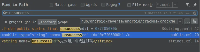 发现这个字符串定义在 string.xml 中的 unsuccessd ,在写代码的时候就是 R.string.unsuccessd,这是一个 int 值,编译后就直接是一个数字了。我们再来全局搜索 unsuccessd :