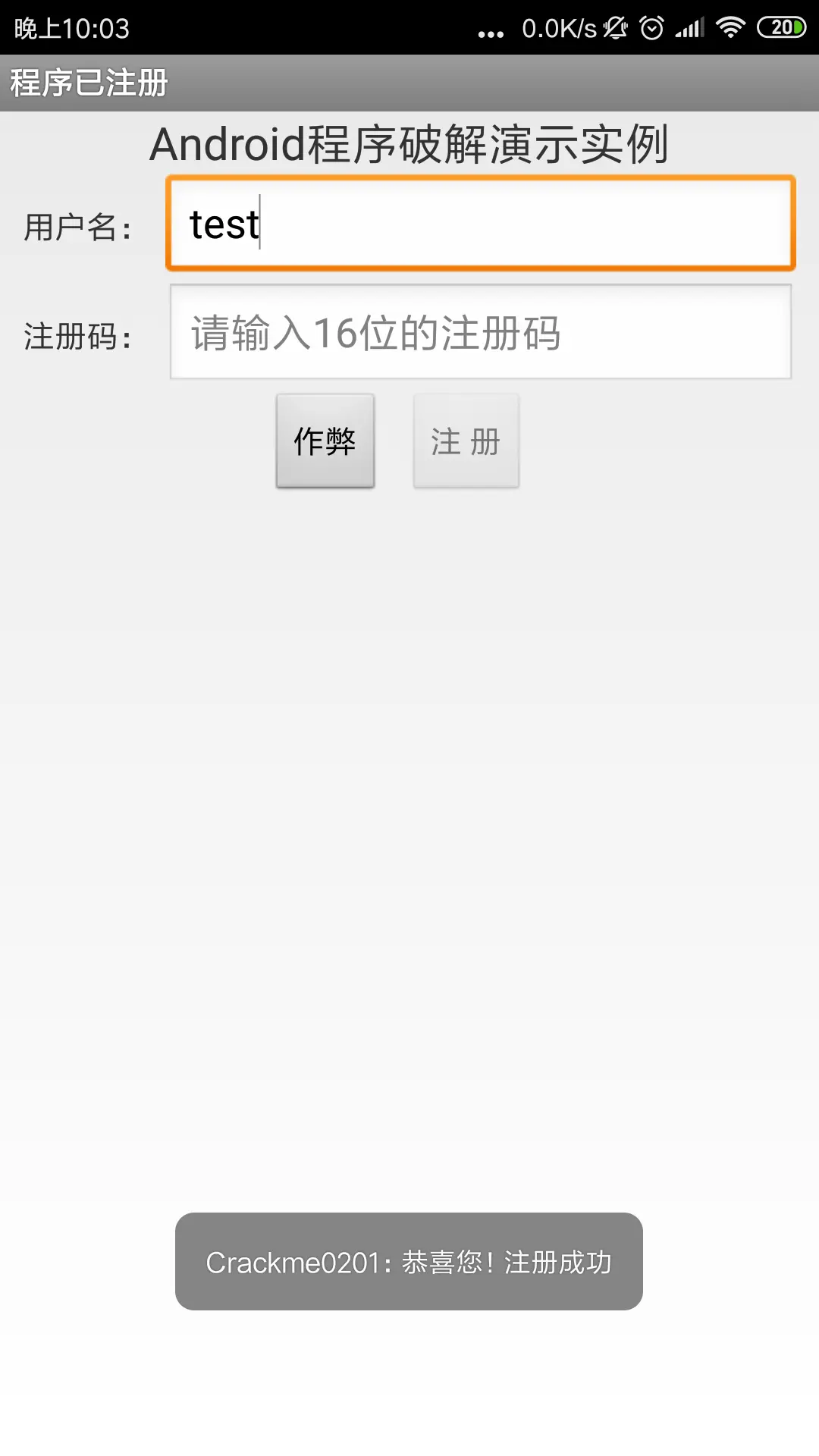 要求就是通过注册。爆破的方法很多,大致可以归为三类,第一种是直接修改 smali 代码绕过注册,第二种是捋清注册流程,得到正确的注册码。第三种是 hook 。下面就来说说这几种爆破过程。