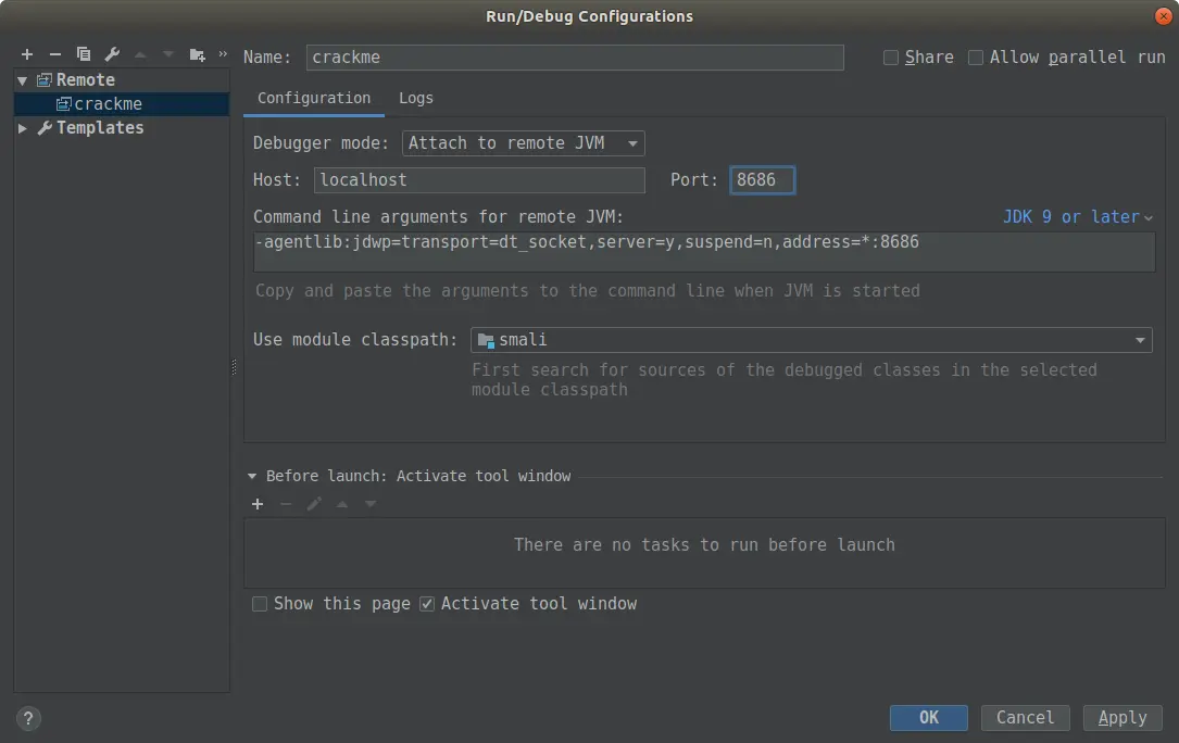 第二步,将之前反编译得到的 smali 文件夹导入 Android Studio 或者 IDEA,并配置远程调试环境。选择 Run -> Edit Configurations,点击左上角 + 号,选择 Remote,弹出配置窗口,如下图所示: