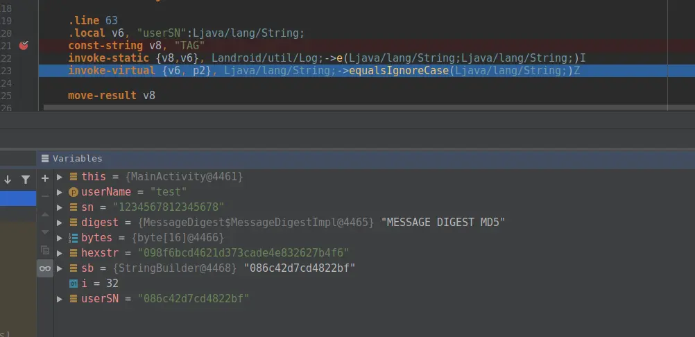 最后在 Android Studio 或 IDEA 中启动 debug 。 点击 Run -> Debug,应用就进入调试模式了。之后的操作就和我们开发中的 debug 模式一模一样了。我们可以在运行中看到寄存器中的值,运行逻辑一览无遗。运行至注册码校验处的断点,截图如下: