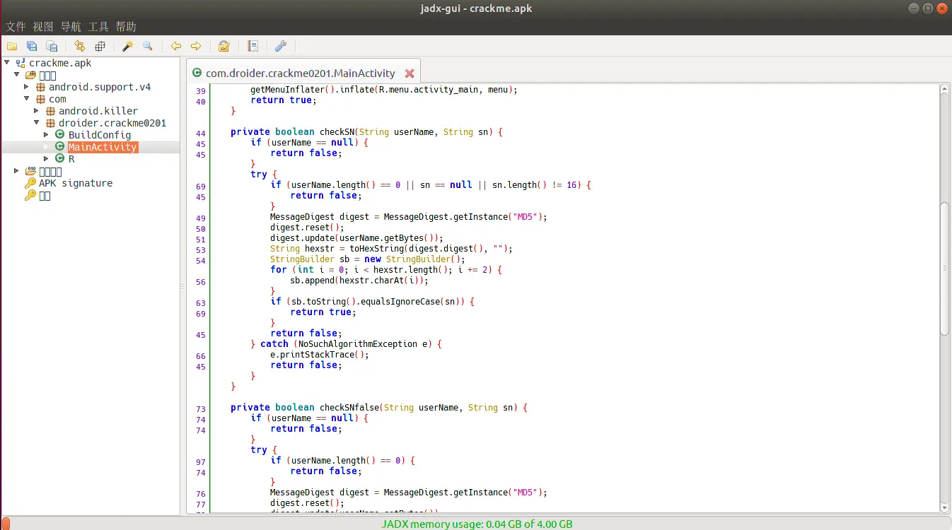 最后再介绍一个反编译利器 JADX ,它可以直接将 Apk 反编译成 Java 代码进行查看,毕竟 smali 代码不是那么人性化。我拿到一个 Apk,基本上第一件事就是丢到 JADX 中进行查看,它同时支持命令行操作和图形化界面。我们就用 JADX 打开这个 CrackMe 应用看一下: