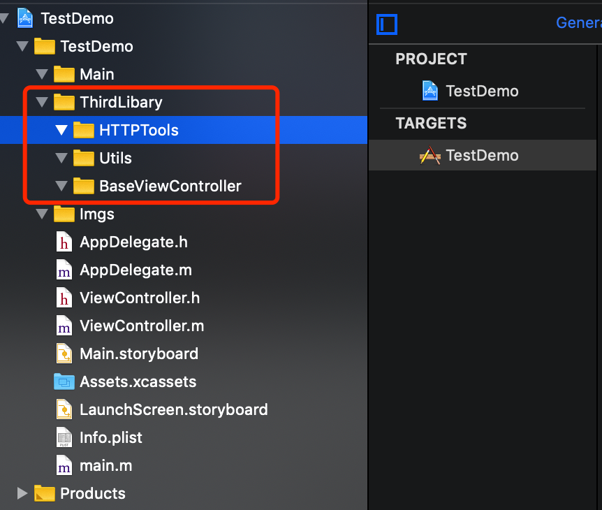 - ThirdLibary 目录的主要作用就是存放 第三方库(一般用cocoaPods代码管理工具)和我们自己封装的一些控件和基类