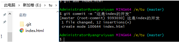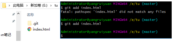 第三步:将index.html 和index.css文件使用 git add 进行添加:是将文件保存到了暂存区。