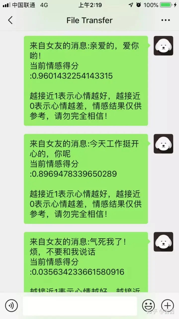 print("来自女友的消息:%s 当前情感得分:%s 越接近1表示心情越好,越接近0表示心情越差,情感结果仅供参考,请勿完全相信! " % (msg.text, now_mod_rank))
