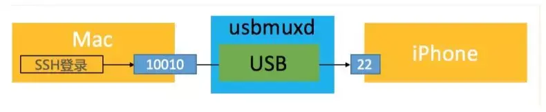 • 默认情况下,由于SSH走的是TCP协议,Mac是通过网络连接的方式SSH登录到iphone,要求iPhone连接WIFI,为了加快传输速度,也可以通过USB连接的方式进行SSH登录,Mac上有个服务程序usbmuxd(开机自动启动),可以将Mac的数据通过USB传输到iphone,路径是/System/Library/PrivateFrameworks/mobileDevice.framework/Resources/usbmuxd