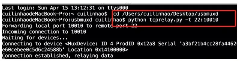 • 将iphone的22端口(SSH端口)映射到Mac本地的10010端口