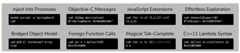 Cycript 是Objective-C++ JavaScript Java等语法的混合物,可以用来探索,修改,调试正在运行的Mac\ios App