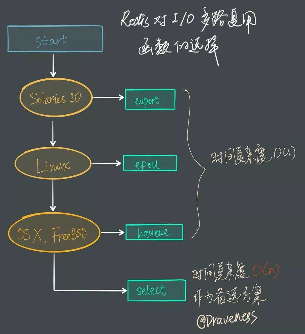 Redis 会优先选择时间复杂度为 $O(1)$ 的 I/O 多路复用函数作为底层实现,包括 Solaries 10 中的 evport、Linux 中的 epoll 和 macOS/FreeBSD 中的 kqueue,上述的这些函数都使用了内核内部的结构,并且能够服务几十万的文件描述符。