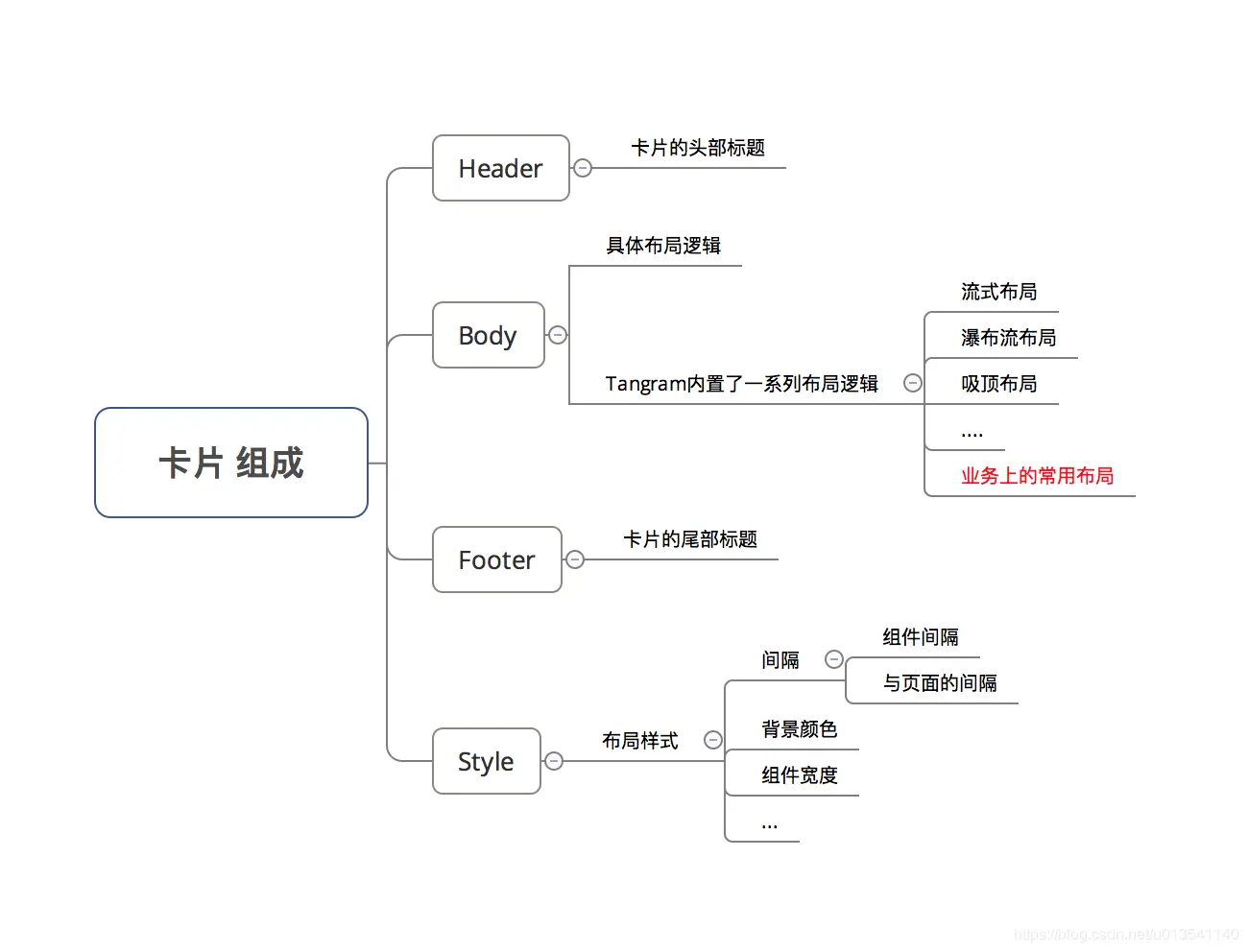 最重要的是 body 部分,它包含了内嵌的组件,如果布局没有 body,即没有组件,也就不在视觉上做渲染。卡片的布局也就是对 body 里包含的组件来进行布局。Tangram 内置了一系列布局能力对组件进行布局,包括流式布局、瀑布流布局、吸顶布局、悬浮布局、轮播布局等等,基本上常见的布局方式都可以覆盖到。header、footer 是卡片的标题和尾部,目前只有轮播卡片、通用流式卡片支持 header、footer。style 是对布局样式的描述,所有布局会有一些通用的样式属性比如边距、间距,也有一些特有的比如宽高比,通过样式的描述,可以让布局能力更加丰富。