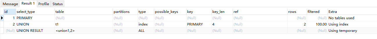 首先说下union的语义,union的语义是取两个结果的并集,重复的保留一行,然后我们来看下explain的结果,第二行的key=PRIMARY,说明用到了主键索引。