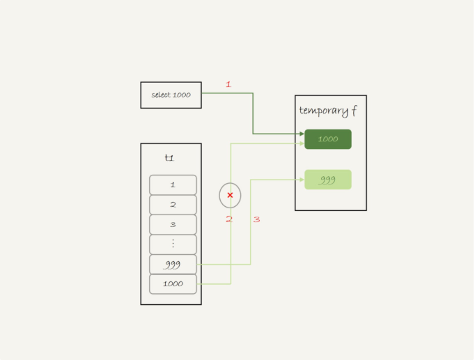 1.插入1000进入临时表,因为主键冲突,插入失败