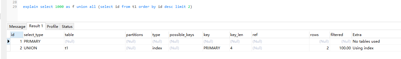 explain select 1000 as f union (select id from t1 order by id desc limit 2)
