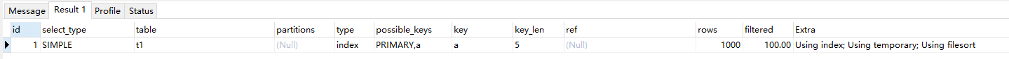 Using index(使用到了覆盖索引a,不需要回表); Using temporary(用到了临时表); Using filesort(对数据进行了排序)