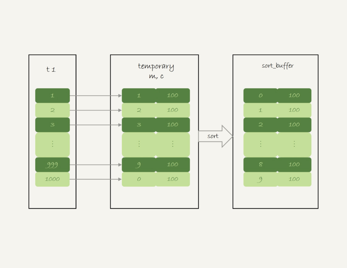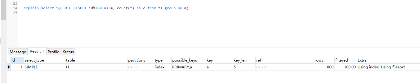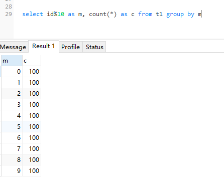 select SQL_BIG_RESULT id%100 as m, count(*) as c from t1 group by m;