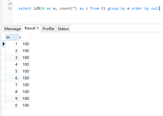 select id%100 as m, count(*) as c from t1 group by m order by null limit 10