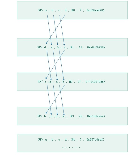 设Mj表示消息的第j个子分组(从0到15),<<< s表示循环左移s位,则四种操作为: FF(a,b,c,d,Mj,s,ti)表示a=b+((a+(F(b,c,d)+Mj+ti)<<< s)