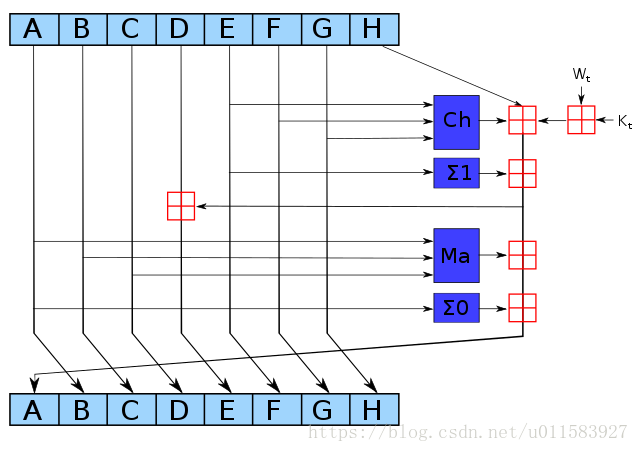 在对所有消息分组完成上述计算之后,计算最终输出。对于SHA-256,是所有H(N)0、H(N)1到H(N)7的串联。对于SHA-224,则是H(N)0、H(N)1直到H(N)6的串联。