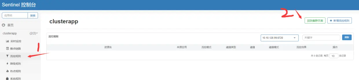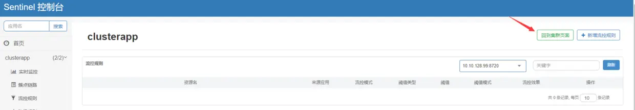 以上准备工作完成之后,下面可以新建资源了。为了观察限流效果光差,新建的资源名与测试案例中的资源名一致:点击流控规则菜单项,然后点击右上角的回到集群界面: