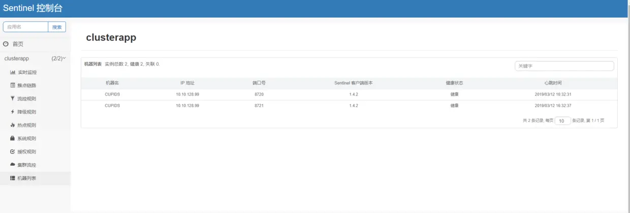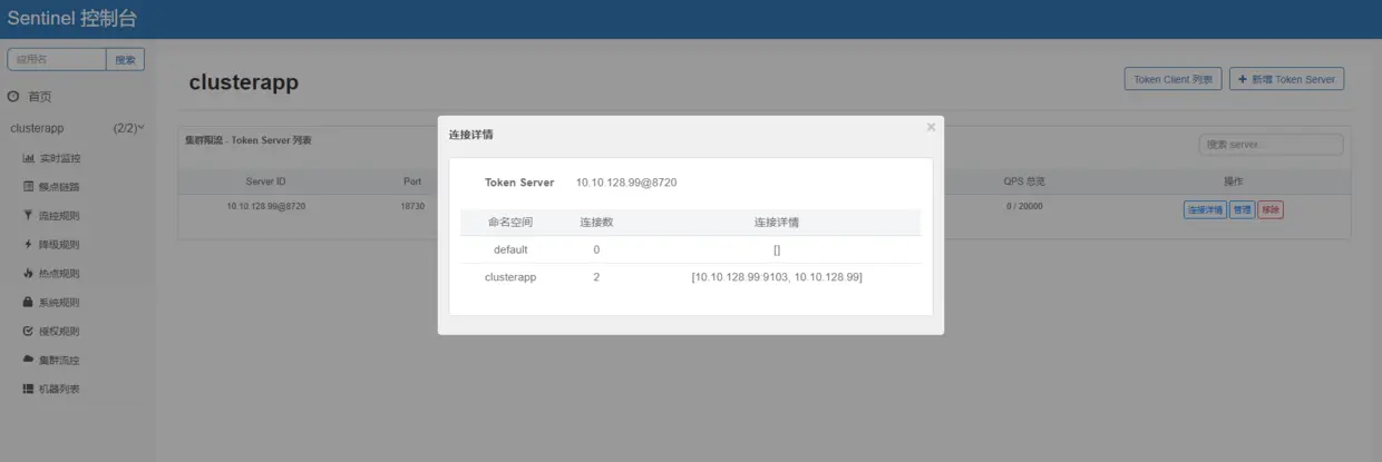 此时,再查看集群流控菜单项,发现已经有了server信息,通过连接详情发现已有两个连接,这是这是嵌入式,server端本身也是一个应用实例