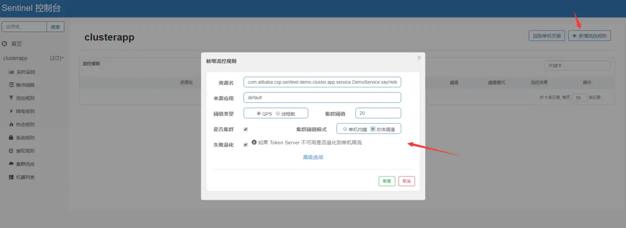 为什么这里要在集群界面新建规则呢?上面已经说过了,针对集群规则界面已经做了修改,规则可以持久化到nacos配置中心