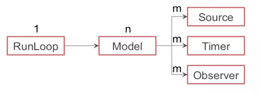 线程和RunLoop一一对应, RunLoop和Mode是一对多的,Mode和source、timer、observer也是一对多的