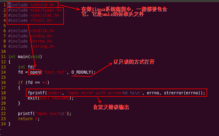 通过这个程序,我们可以看到,用fprintf(关于它的使用,随后会进行详述)可以自定义错误输出格式,会比perror更加灵活。