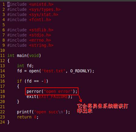 可见perror的出错信息的格式是固定的,不是太灵活,下面再看下更灵活打印错误的方式: