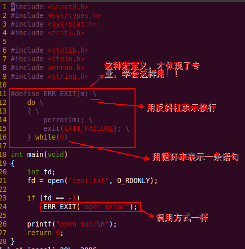 下面要对代码进行封装了,对于程序出错都需要输出错误信息,并且让程序退出,所以,可以将上面这种错误输出的方式定义为宏,方便其之后调用,如下:
