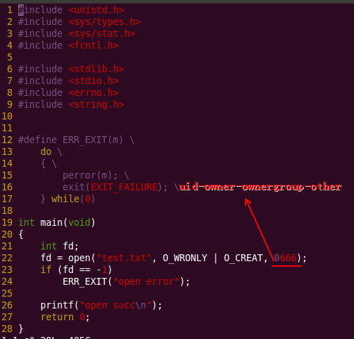 理解了文件权限相关的知识,回到上面的程序来,我们在创建程序时,给定的文件权限是0666,也就是rw-rw-rw- ,但是从实际创建的文件来看,它的权限是: