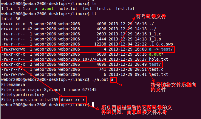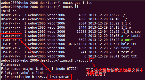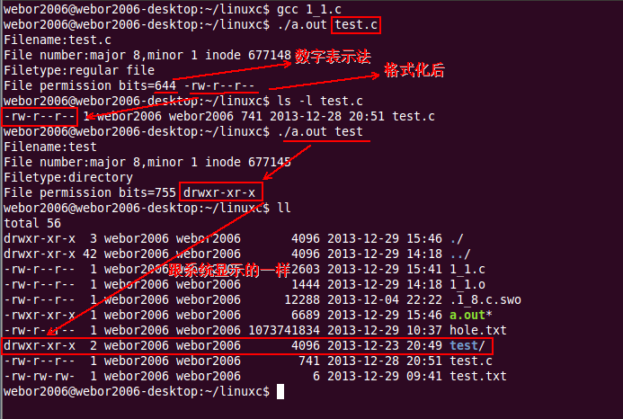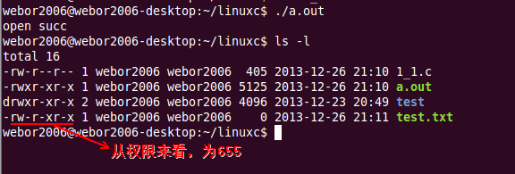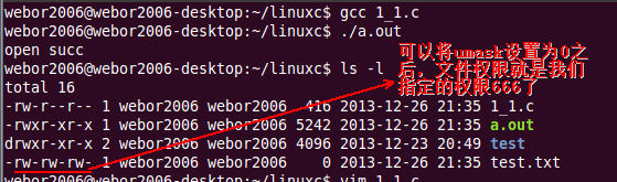 先来按上面的公式来推算下创建文件的权限:0655-0022=0633,编译运行,见证事实啦: