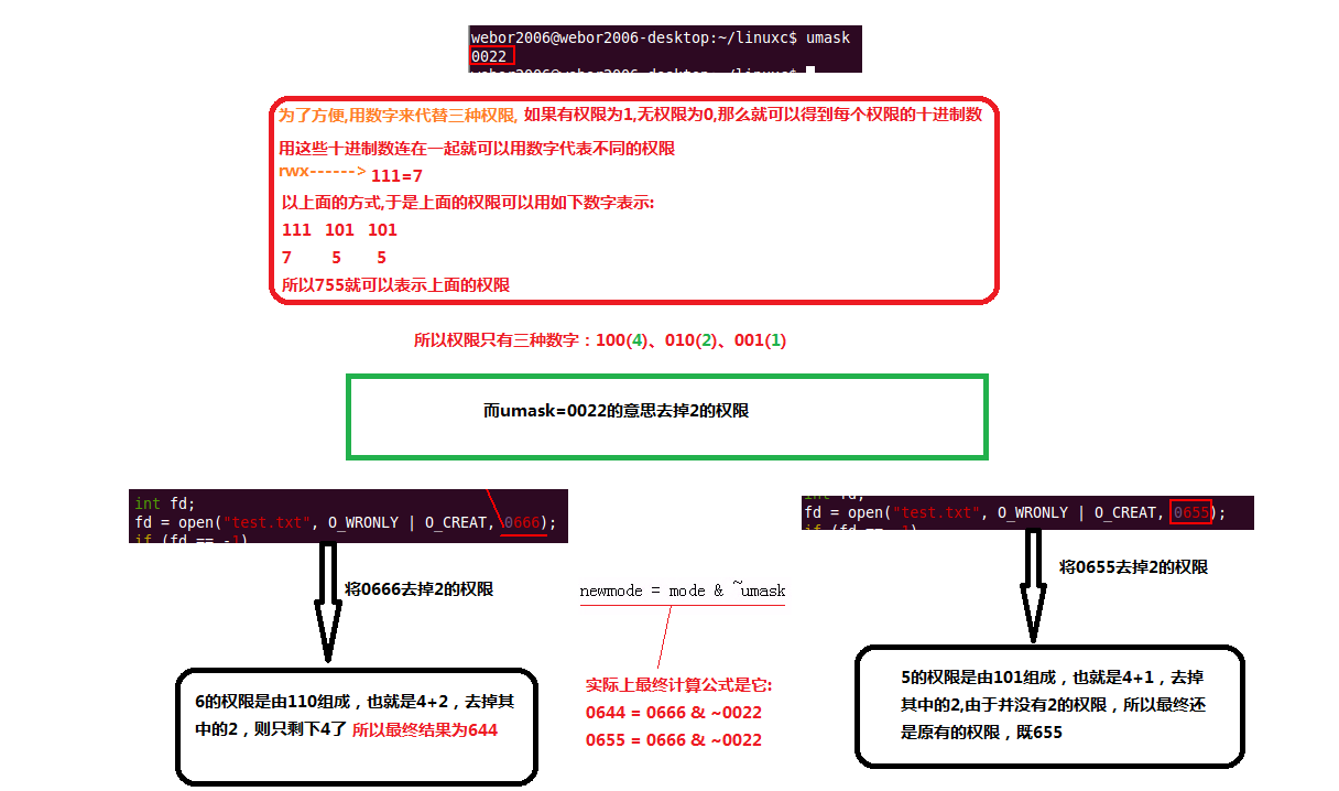 可见,上面算权限的公式并非只是算术与umask相减,用简单的图来说明下umask的真正意义:
