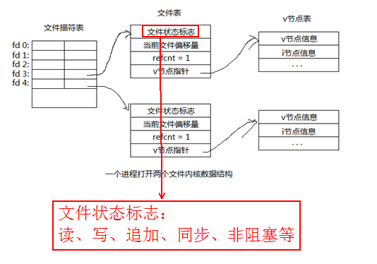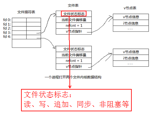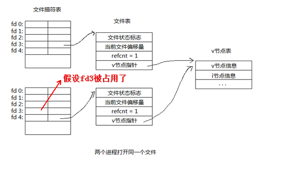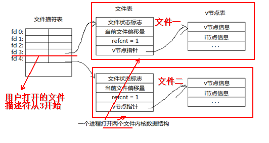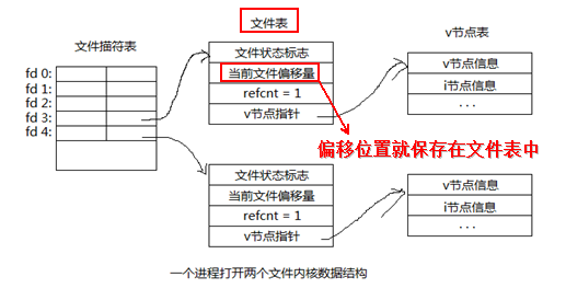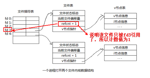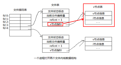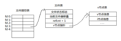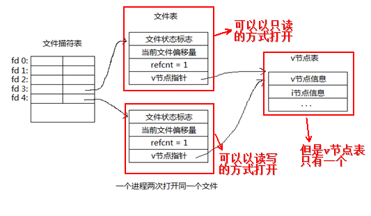 总结:每打开一个文件描述符,就有一个对应的文件表项描述,而如果打开的是同一个文件,v节点表是共享的