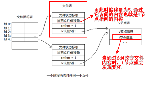 由于它会改变v节点表中的i节点信息所指向磁盘中的数据,而两个文件描述符的v节点表是共享的,而fd1此时的偏移量为5: